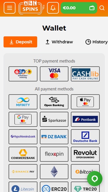Banking銀⾏業務選項 的 AllSpins Casino