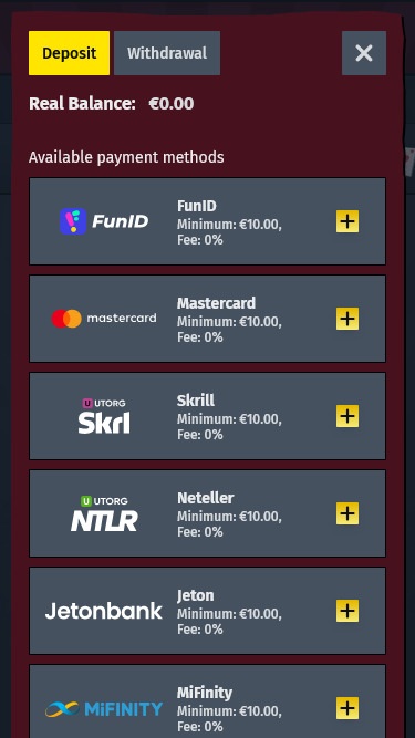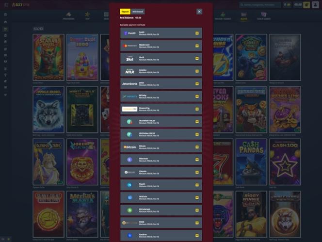 Allyspin Casino 採用現代化的方式來實現支付無障礙,該品牌允許玩家使用多種傳統銀行業務選項,例如Visa 、 Mastercard 、銀行電匯、 Skrill 、 Neteller和MiFinity ,同時也允許玩家使用現代加密支付方式,例如比特幣、比特幣現金、卡爾達諾、狗狗幣、以太坊、萊特幣、以太幣Tether幣。
