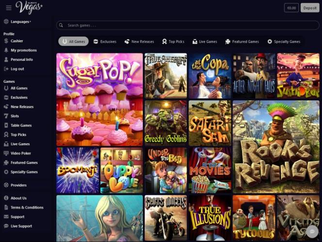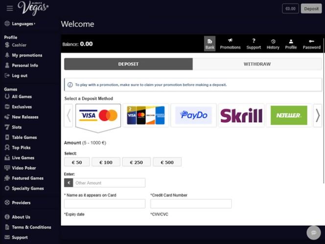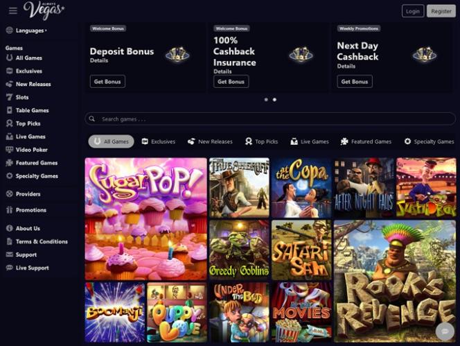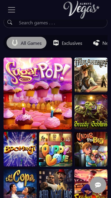 Always Vegas Casino 由 BetSoft, Rival and Fresh Deck Studios提供支持,其賭場庫可透過可下載的軟體以及基於網路的平台存取。其他遊戲