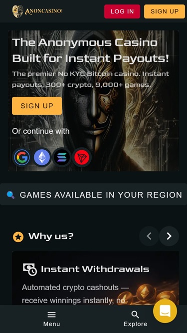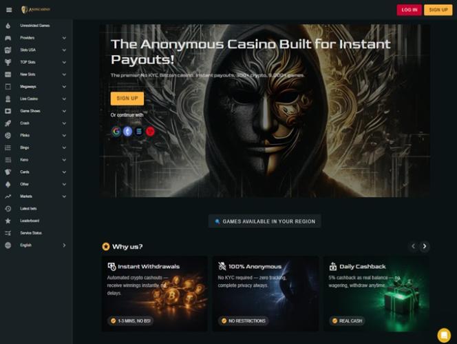 在視覺呈現方面,這家賭場明顯採用了「匿名」的賽博龐克風格,以一位神秘的蒙面男子作為主要吉祥物,並搭配深色背景和金色調的時尚配色方案。在易用性方面,玩家可以輕鬆瀏覽所有版塊和遊戲,因為使用者介面非常直覺簡潔。