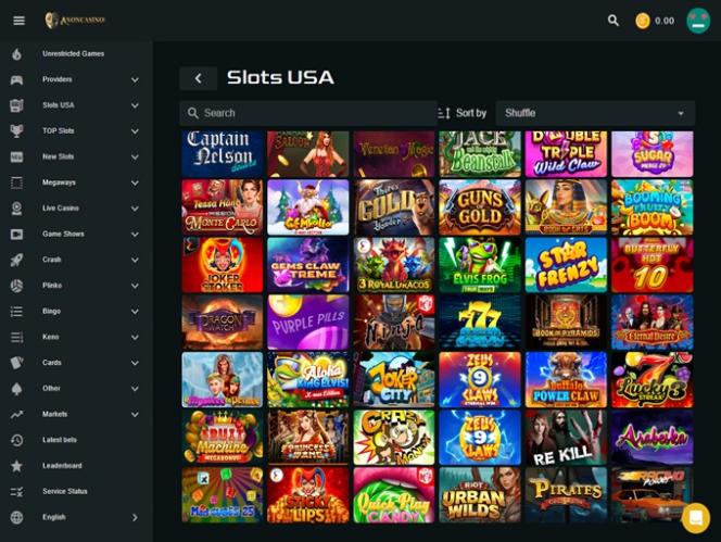 因此,這家博弈網站非常重視其龐大的遊戲庫,這些遊戲來自70多家軟體供應商。 這裡提供數千款遊戲,涵蓋多種類型和類別,因此總有新鮮刺激的遊戲可供體驗。以下是AnonCasino提供的軟體供應商: Net Entertainment , Real Time Gaming , BetSoft , Big Time Gaming , Espresso Games , Ezugi , Novomatic , Play'n GO , playson , Quickspin , Thunderkick , Vivo Gaming , Yggdrasil , Endorphina , Betgames , Pragmatic Play , Nolimit City , Red Tiger Gaming , ZEUS Services , Booongo , Xprogaming , Belatra Games , Kalamba , Revolver Gaming , Nucleus Gaming , Spadegaming , BGAMING , Evoplay , Triple PG , Bulletproof Games , Mascot Gaming , NetGame Entertainment , DLV , Spearhead Studios , 7Mojos , KA Gaming , Spinlogic Gaming , Caleta Gaming , Eurasian Gaming , Blueprint Gaming , CT Interactive , Greentube , Igrosoft, Tom Horn Gaming, Reel Time Gaming, BF Games, Reflex Gaming, 4ThePlayer, ReelPlay, Indi Slots, Vibra Gaming, Boomerang Studios, Hacksaw Gaming, Gamzix , Triple Cherry, Peter And Sons, Lotto Instant Win, Onlyplay , FastSpin, Lucksome Gaming, Gamebeat, Aviatrix, 3 Oaks Gaming , Amigo Gaming, Spribe , BetSolutions, Reel Kingdom , Formula Spin, Clawbuster, Orbital Gaming, InOut Games and Penguin King