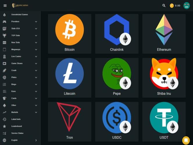 該賭場只接受加密貨幣。 玩家無法使用法定貨幣進行存款或提款。 提款即時到帳。 玩家可以直接透過網站使用傳統支付方式購買加密貨幣。 無需進行 KYC 驗證;玩家只需在網站上註冊即可登入並提取獎金。 雖然該網站不限制對其平台的訪問,但特定遊戲的可用性取決於玩家連接的 IP 位址。 該業者不收取存款手續費。提款手續費由賭場的支付處理商計算。 如前所述,AnonCasino 是一家專注於加密貨幣的線上賭場。玩家可以使用傳統支付方式直接在網站上購買加密貨幣,但網站上的所有交易均以加密貨幣進行。該品牌接受超過 300 種不同的加密貨幣,包括比特幣 、比特幣現金、卡爾達諾、達世幣 、狗狗幣 、 EOS 、以太坊、萊特幣、索拉納、 Toncoin 、波場 幣、美元幣 、泰達幣、門 羅幣、瑞波幣、 Zcash 、FUN 和NEO 。