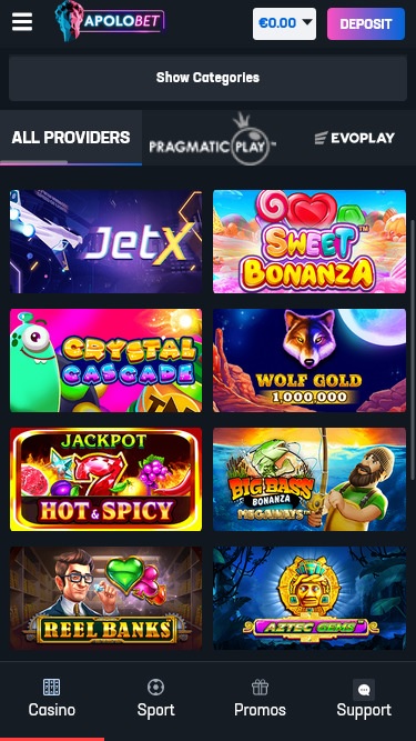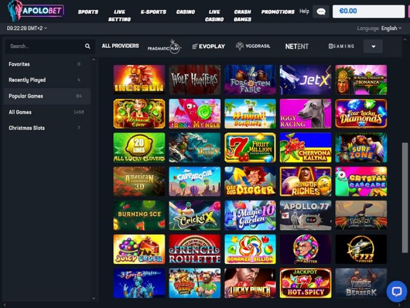 由於iGaming產業競爭異常激烈,對於線上博弈營運商而言,找到能夠為賭場玩家提供優質內容的合作夥伴至關重要。 ApoloBet與一些知名的線上賭場軟體開發商合作,其中包括Evolution Gaming、Pragmatic Play、Yggdrasil等知名公司。
