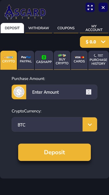 對於加密貨幣存款,Asgard Slots 提供了一個簡單的指南,幫助您開始使用比特幣和其他加密貨幣。