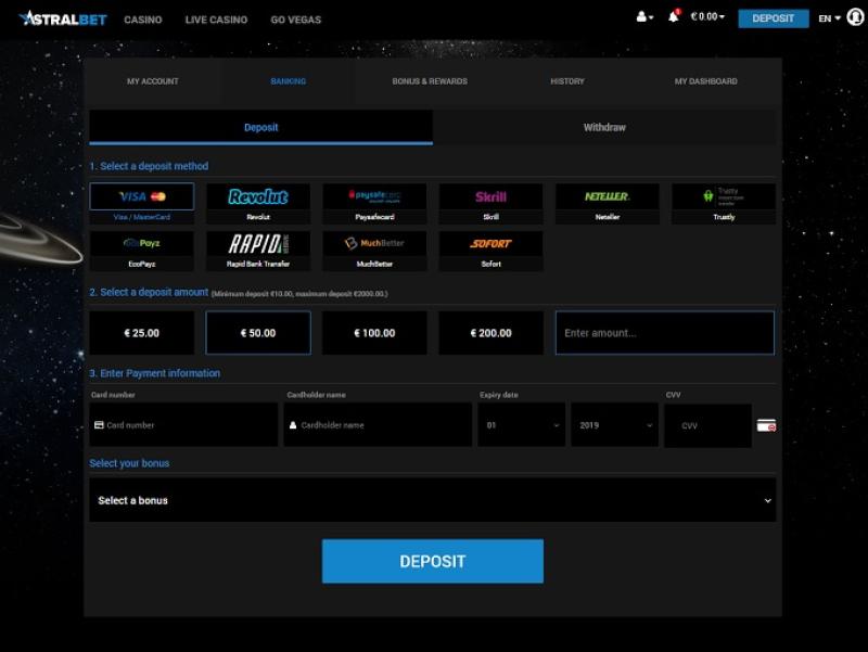 AstralBet 賭場的銀行系統非常完善,支援 MasterCard、Visa、Skrill、Neteller、Paysafecard、NeoSurf、SOFORT、ecoPays、Trustly、GiroPay 和 Zimpler 等多種支付方式的存款和提款。電子錢包的支付速度幾乎是即時的,其他支付方式的支付速度也非常快。如果有什麼缺點的話,那就是每月的支付限額為 60,000 美元。這是一個缺點,因為如果您贏得了巨額累積獎金,您可能需要等待數月才能看到獎金存入您的帳戶。