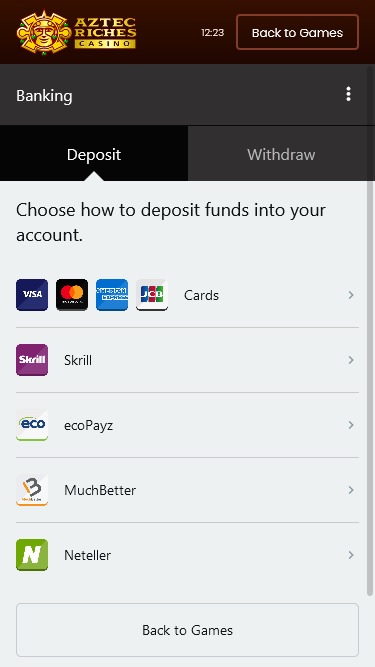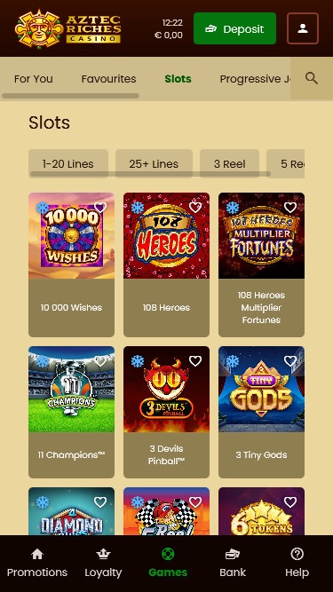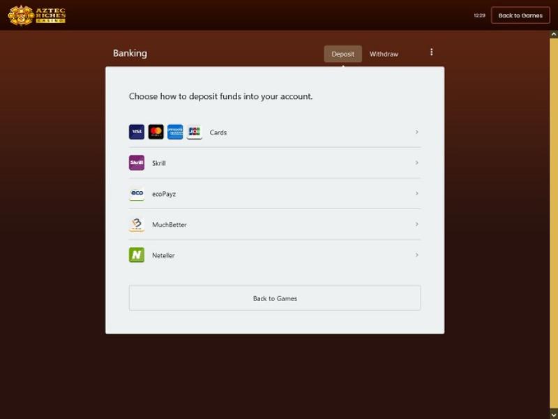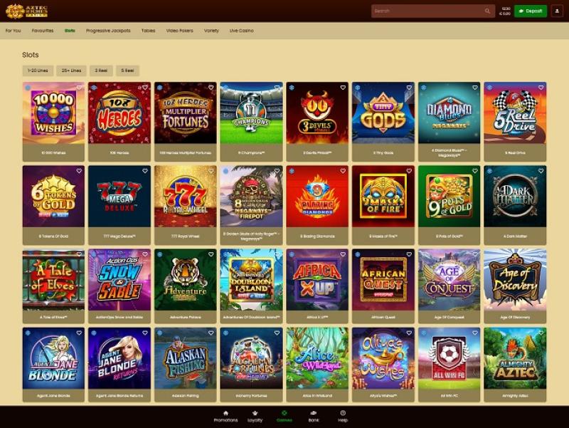 Aztec Riches 賭場由 Microgaming, Evolution Gaming, Rabcat, Triple Edge Studios, Northern Lights Gaming, Stormcraft Studios, Switch Studios, Electric Elephant Games, All41 Studios, Gameburger Studios, Pulse 8 Studios, Neon Valley Studios, SpinPlay Games, Real Dealer Studios, GONG Gaming, On Air Entertainment, Buck Stakes Entertainment, Games Global, Old Skool Studios, Foxium, Just For The Win, PearFiction Studios, Slingshot Studios, Fortune Factory Studios, Crazy Tooth Studio, Alchemy Gaming, Snowborn Games, Gold Coin Studios, Half Pixel Studios, Eurostar Studios and Aurum Signature Studios提供支持,為玩家提供數百種不同的遊戲。賭場可透過下載或網頁平台訪問,此外,還為希望在智慧型手機或平板電腦上玩遊戲的玩家提供行動平台。Baccarat
