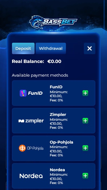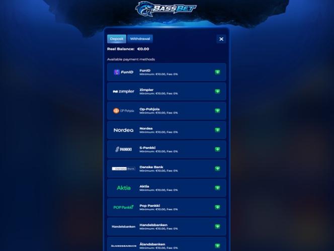 Bassbet Casino 採用現代化的支付方式,玩家可以使用多種傳統和現代銀行服務進行存款和提款。標準支付方式包括Visa 、 Mastercard 、 Skrill 、 Neteller 、 Jeton 、 Paysafecard 、 MiFinity和銀行電匯。此外,現代銀行服務也支援比特幣、比特幣現金、狗狗幣、以太幣、萊特幣、 USD Coin 、泰達幣和瑞波幣等加密貨幣。