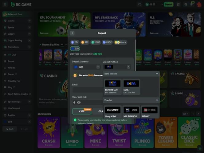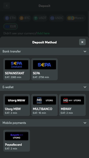 正如我們已經提到的,這個賭博品牌只支援加密貨幣,並且有許多可用的加密貨幣和加密融資選項。