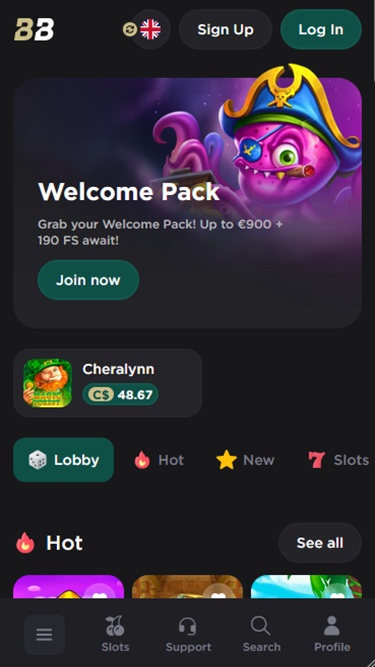 首頁歡迎網站訪客。它主要宣傳歡迎禮包,並提示他們建立帳戶。在促銷橫幅下方,您可以查看所有類別和類型的熱門遊戲以及所有可用獎勵的資訊。