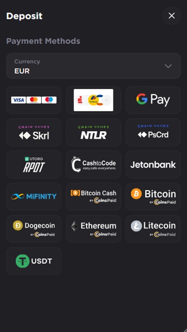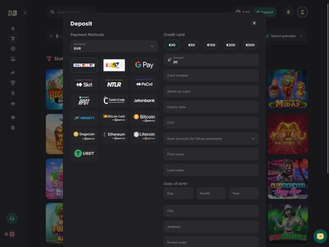 您還可以存取兩個水平選單,快速瀏覽所有遊戲類別、付款方式、促銷活動和VIP方案。所有內容都井然有序,讓您輕鬆存取喜愛的遊戲。除了英語版本,該網站還提供法語和德語版本。