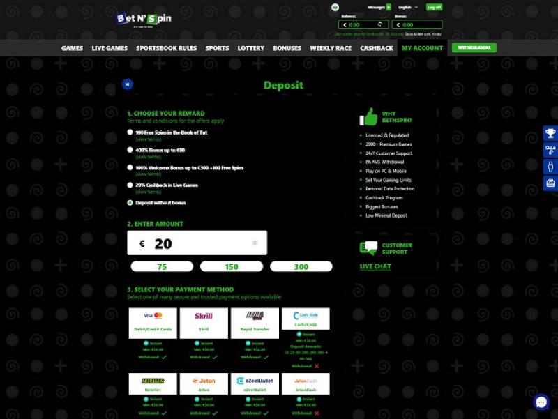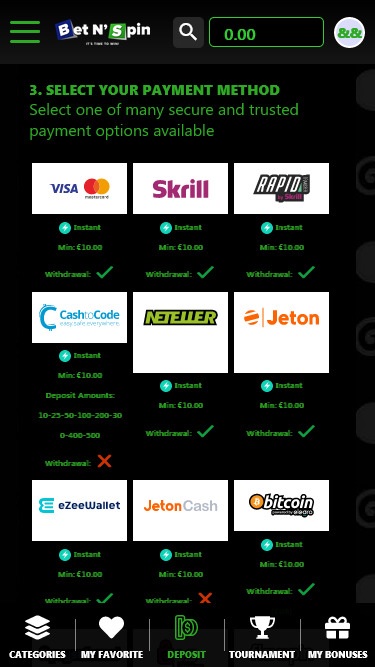 Bet N Spin 賭場由 Microgaming, Net Entertainment, BetSoft, 1x2gaming, Big Time Gaming, ELK Studios, Evolution Gaming, Ezugi, Habanero Systems, iSoftBet, Oryx, Play'n GO, playson, Quickspin, Relax Gaming, Thunderkick, Endorphina, Wazdan, Betgames, Booming Games, BetConstruct, Pragmatic Play, Red Tiger Gaming, Booongo, Red Rake Gaming, Inbet Games, Xprogaming, Fugaso, Kalamba, Revolver Gaming, Spinmatic, Spadegaming, Triple Edge Studios, BGAMING, Fazi, Evoplay, Pocket Games Soft, Mascot Gaming, Slot Factory, Spearhead Studios, Swintt, SmartSoft Gaming, KA Gaming, Lady Luck Games, Caleta Gaming, Games Global, Amusnet Interactive, Wizard Games, CT Interactive, NextGen, Pariplay, Push Gaming, Tom Horn Gaming, Genii, Gamomat, Mr Slotty, Apollo Games, Golden Hero, NetGaming, High 5 Games, Hacksaw Gaming, Gamzix, Arcadem, Peter And Sons, Onlyplay and Armadillo Studios提供支持,其遊戲透過網頁平台提供,可直接透過您的網頁瀏覽器載入。該賭場還全面支援行動端遊戲,您可以在智慧型手機或平板電腦上投注。