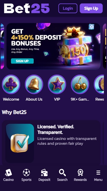Bet25成立於2025年,是一家大型線上賭場,接受來自德國、奧地利、芬蘭、加拿大和紐西蘭的玩家,並邀請他們探索其豐富的賭場遊戲和體育博彩選項。該品牌提供數千款線上老虎機、真人荷官遊戲、桌上遊戲和即時投注遊戲,並為玩家提供各種促銷活動和獎勵。