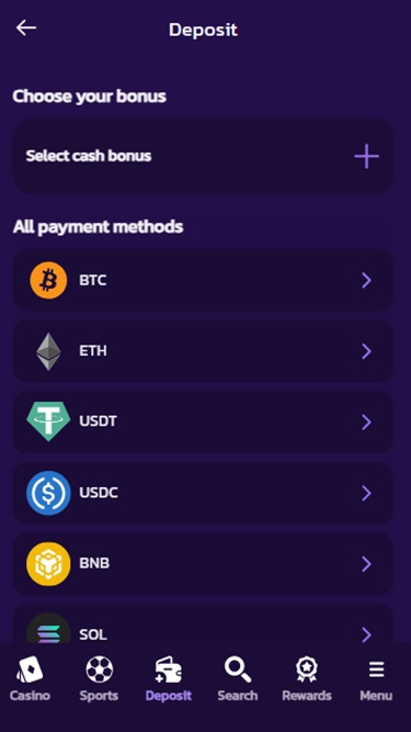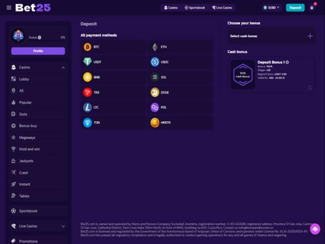 Bet25 主要是一家以加密貨幣為導向的線上賭場,您可以使用多種加密貨幣進行存款和提款,包括比特幣、比特幣現金、狗狗幣、以太坊、萊特幣、索拉納、 Toncoin 、 Tron 、USD Coin 和泰達幣。