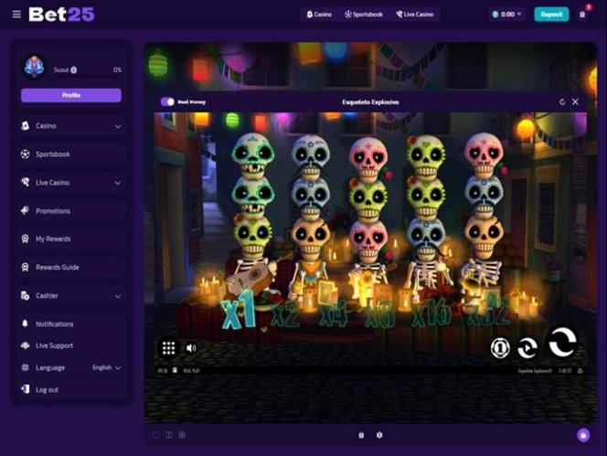 此外,真人娛樂場愛好者一定會喜歡在 Bet25 玩各種精彩的遊戲節目。該品牌提供數十款精彩的真人娛樂場遊戲節目供您選擇,其中一些最受玩家歡迎的遊戲包括:Deal or No Deal、Funky Time、Dead or Alive: Saloon、Ballon Race、Extra Chilli Epic Spins、Lightning Storm、Super Color Game、Agent Spinity 和 Cards Champion。