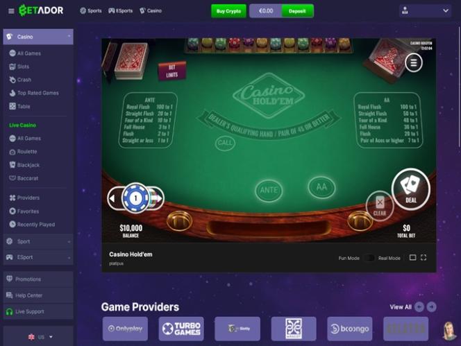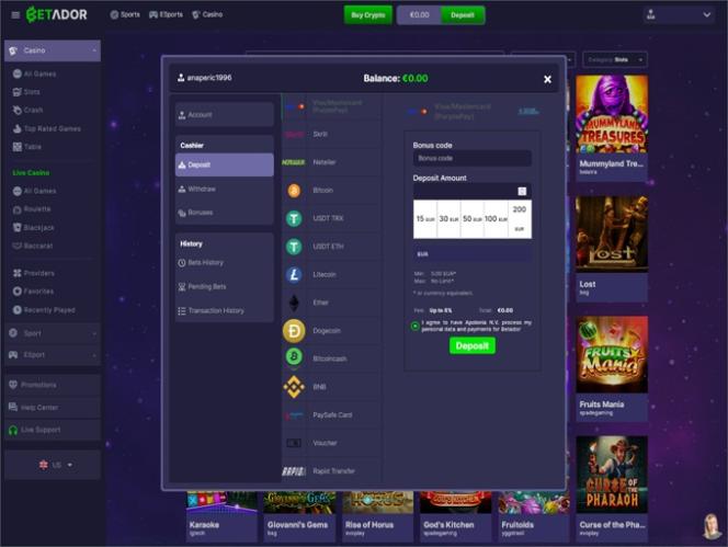 Betador Casino 支援各種流行的加密貨幣和加密支付選項,但它也包括傳統銀行方式,如金融卡和信用卡、知名的電子錢包和其他線上支付系統。