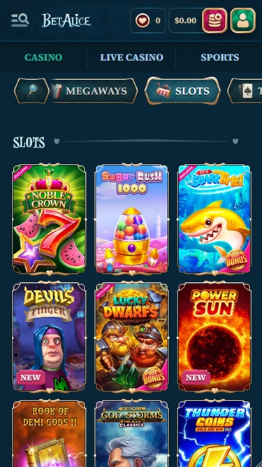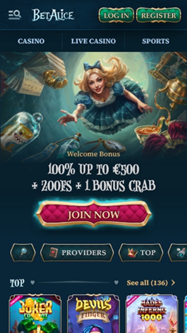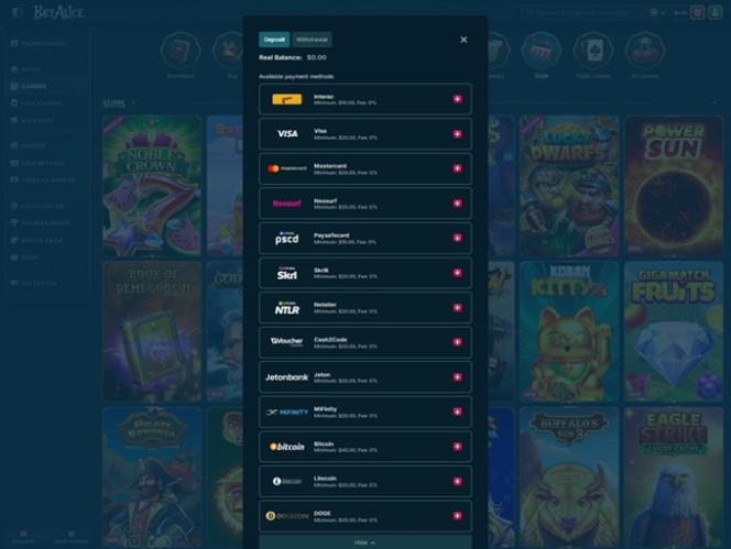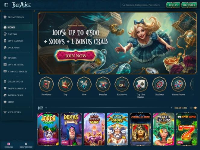 BetAlice 包括賭場、真人娛樂場和體育部分,因此玩家將有機會探索各種賭場類型、嘗試不同類型的獎金並參與 VIP 計劃。