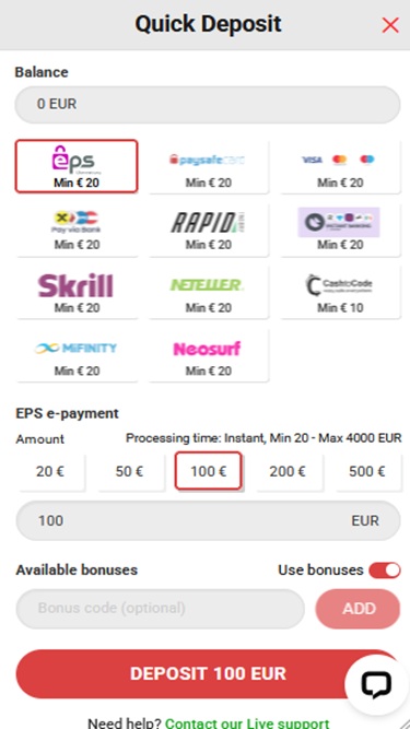 100% Bonus up to a maximum bonus of $1,000.00. Can be used one time per day. The maximum cash out up to $2,000. The bonus chips are unredeemable and will be removed from the associated cashout. Offer for USA and Canada only.