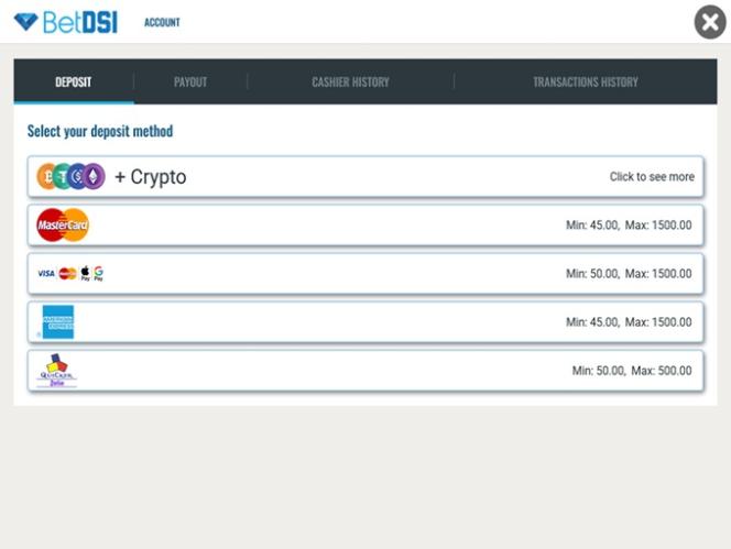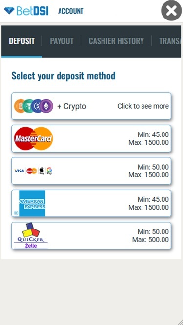 正如我們之前提到的,BetDSI 接受加密貨幣作為有效的付款方式。比特幣、以太幣、萊特幣和瑞波幣只是眾多可用貨幣的一部分。但請注意,大多數加密貨幣僅接受存款方式,提款方式則相對單一。