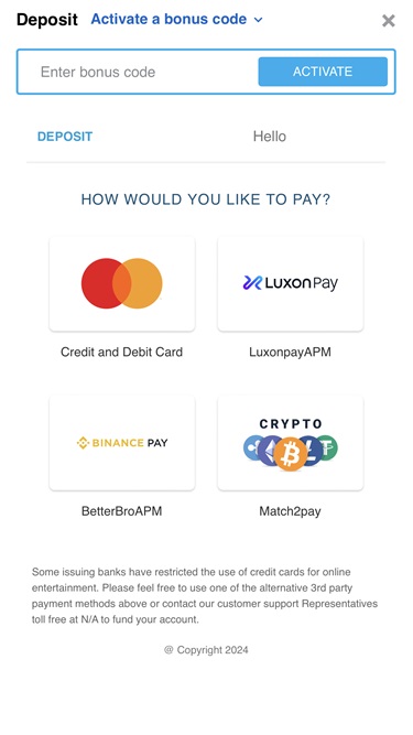 我們很高興看到該品牌為玩家提供了非常廣泛的付款選項。首先,我們提供Visa 、 Mastercard 、 AstroPay 、 Jeton和Interac等傳統支付方式。此外,我們也接受加密貨幣存款和提款,可用貨幣包括比特幣、以太幣、萊特幣、泰達幣、波場幣和瑞波幣。