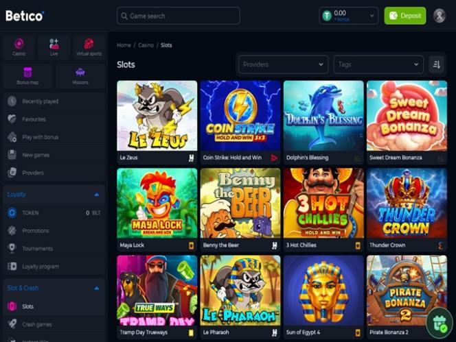 這個線上博弈網站擁有精美的主題和宜人的氛圍,我們第一眼就喜歡上了它。網站導航非常便捷,尤其值得一提的是,Betico 支援多種語言,包括捷克語、德語、英語、西班牙語、法語、匈牙利語、印尼語、日語、波蘭語等等。在這個平台上,一切都以玩家為中心,因此尋找自己喜歡的新遊戲也輕而易舉。