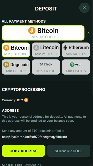 在付款方式方面,玩家可以使用多種選項來管理資金,包括Google Pay 、 Apple Pay和Paysafecard 。該品牌也接受多種加密貨幣作為有效的支付方式,包括比特幣、比特幣現金、卡爾達諾、狗狗幣、以太幣、萊特幣、索拉納、波場幣、美元幣、泰達幣和瑞波幣。