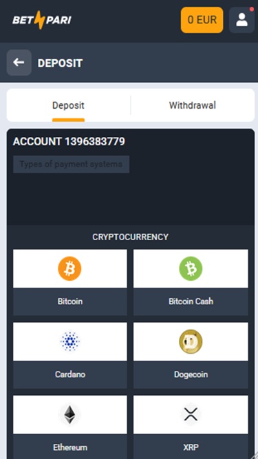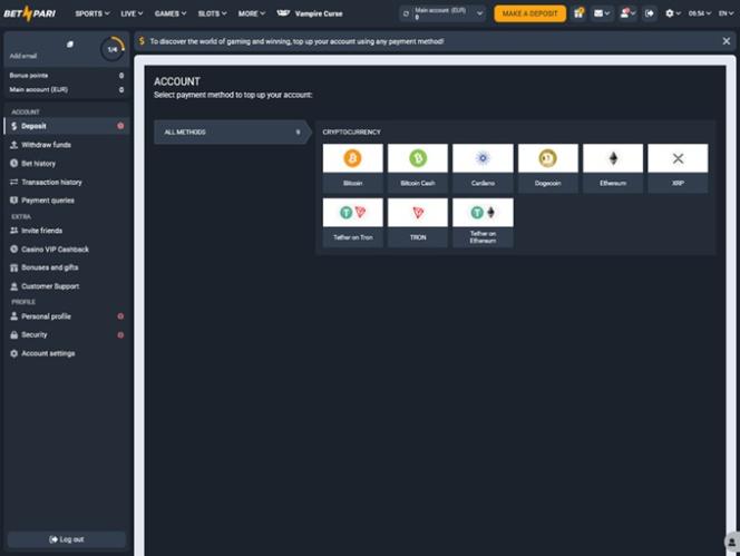 關於支付方式,BetPari 僅接受Visa和Mastercard作為傳統銀行卡支付,不提供電子錢包、銀行電匯或預付卡支付。不過,該品牌接受多種加密貨幣,包括比特幣、比特幣現金、狗狗幣、卡爾達諾、以太幣、瑞波幣、泰達幣和波場幣。