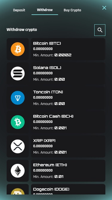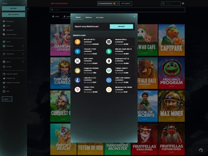 正如我們所提到的,Betrunner Casino 是一個加密貨幣專屬的博彩網站,玩家可以使用多種加密貨幣進行訪問,包括比特幣、比特幣現金、卡爾達諾、狗狗幣、以太坊、 Solana 、泰達幣、 Toncoin 、波場幣、 USD Coin和瑞波幣。還沒有加密貨幣錢包的用戶可以使用Visa和萬事達卡直接從網站購買加密貨幣。