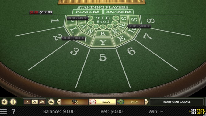 這是⼀種簡化版的Sic bo骰寶。兩種遊戲都是搖出三顆骰⼦, 玩家押注⾄ 少出現⼀次的骰⼦點數。押中⼀顆⽀付1⽐1的賠率, 押中兩顆⽀付2⽐1的 賠率, 押中三顆⽀付3⽐1的賠率。Sic bo骰寶也提供相同的押注, 不過押中 三顆同點數⽀付12⽐1的賠率。