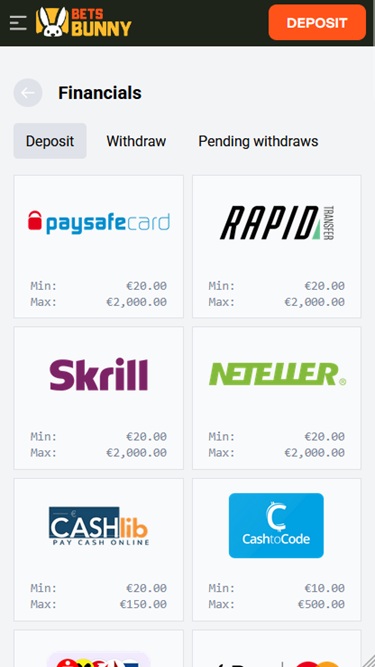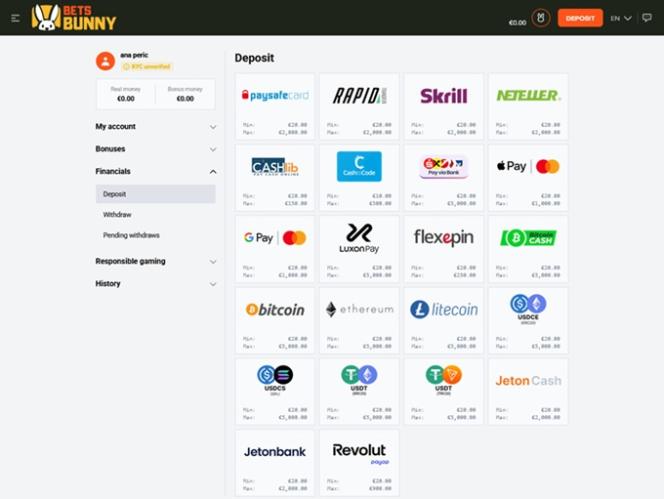 在 Bets Bunny 存取資金簡單直接,因為該品牌接受多種付款方式,包括Visa 、 Mastercard 、 Apple Pay 、 Google Pay 、銀行電匯、 Skrill 、 Neteller 、 Paysafecard和Flexepin 。此外,玩家可以使用多種加密貨幣來管理資金,例如比特幣、比特幣現金、以太幣、萊特幣、 USD Coin和Tether 。