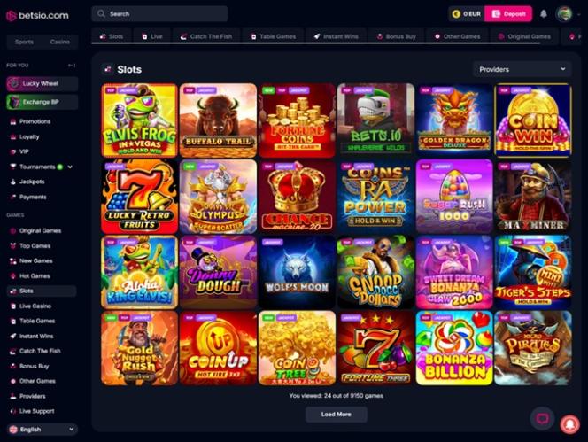 Betsio.com 提供超過五千種老虎機遊戲,線上老虎機部分擠滿了令人驚嘆的遊戲,例如:Bonanza Billion、Elvis Frog in Vegas、Jasmine's Treasures、Fire in the Hole 3、Chance Machine 20、Blast the Bass、Egypt Sun Deluxe、Wild Coaster、Buffalos、Max; Dwarfs、Mega Cash Amplifier、Crypto Gold、Fortune Coins、Book Of Aphrodite、Wild Bandito…