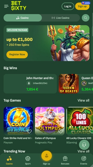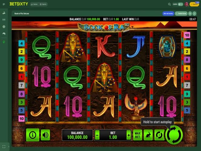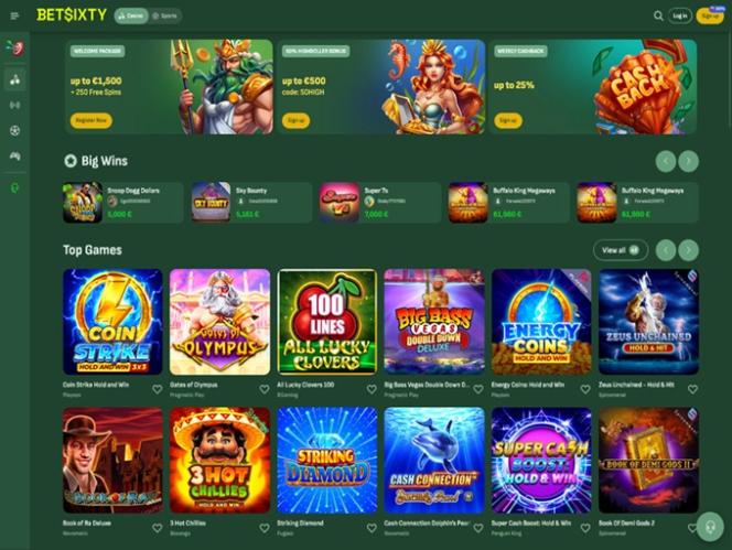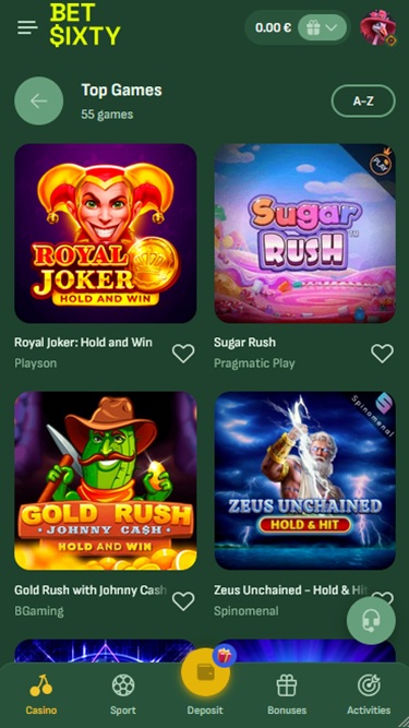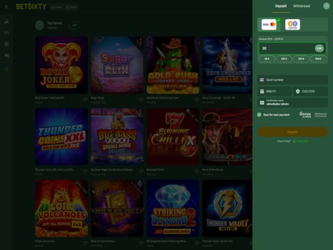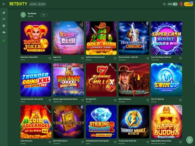 BetSixty 賭場深知其優勢在於豐富的遊戲組合,而考慮到玩家可以體驗的版本數量之多,其提供的遊戲目錄無疑令人驚嘆。桌上遊戲、線上老虎機和真人荷官應有盡有,光是瀏覽所有可選遊戲,您就能花上幾個小時。