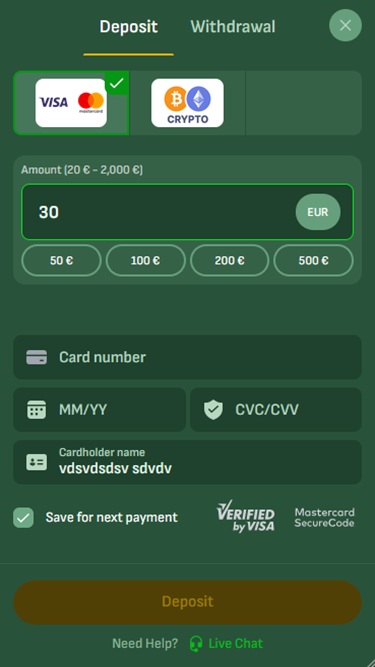 營運商為玩家提供傳統和現代的支付方式選擇。 Visa、 Mastercard 、銀行電匯和MiFinity是其中的一些選擇,但您也可以使用比特幣、以太坊、 Tether和Tron等加密貨幣存入和提取資金。