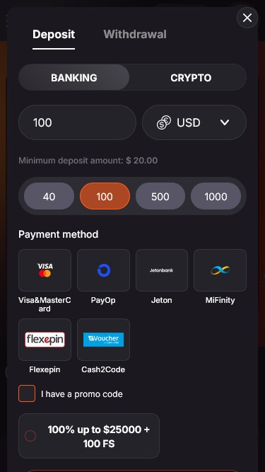 我們提供多種銀行服務選項。玩家可以選擇使用Visa 、Mastercard、Neosurf、Neteller、Skrill、Jeton、Paysafecard 等熱門支付方式。除了這些傳統的銀行服務選項外,營運商還允許使用加密貨幣進行存款和提款。