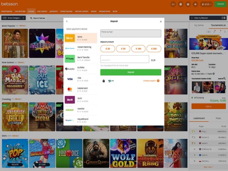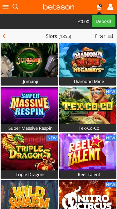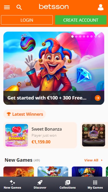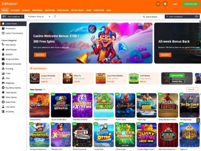 Betsson Casino 由 Microgaming, Playtech, BetSoft, 1x2gaming, Big Time Gaming, ELK Studios, Evolution Gaming, EYECON, Ezugi, Genesis Gaming, Habanero Systems, iSoftBet, lightningboxgames, Novomatic, Oryx, Play'n GO, playson, Quickspin, Rabcat, Relax Gaming, Thunderkick, Yggdrasil, Endorphina, Wazdan, Betgames, Booming Games, Stakelogic, Pragmatic Play, Nolimit City, Felt Gaming, Red Tiger Gaming, Red Rake Gaming, Skillzzgaming, Fantasma Games, FunFair, SYNOT Games, FUGA Gaming, Kalamba, Sigma Gaming, Skywind, Triple Edge Studios, Northern Lights Gaming, Stormcraft Studios, Switch Studios, Electric Elephant Games, Pocket Games Soft, Bulletproof Games, All41 Studios, Gluck Games, Gameburger Studios, Pulse 8 Studios, Neon Valley Studios, Spearhead Studios, SpinPlay Games, Real Dealer Studios, GONG Gaming, Blue Guru Games, Lady Luck Games, On Air Entertainment, Buck Stakes Entertainment, Games Global, Wizard Games, 2by2 Gaming, Ash Gaming, Blueprint Gaming, Greentube, Leander Games, Pariplay, Push Gaming, Inspired Gaming, Genii, Gamomat, RFranco Group, Reel Time Gaming, MGA, Authentic Gaming, Bally Wulff, Iron Dog Studio, Old Skool Studios, Foxium, Just For The Win, The Games Company, Reflex Gaming, MetaGU, PearFiction Studios, Apollo Games, Wild Streak Gaming, Slingshot Studios, Fortune Factory Studios, Jade Rabbit Gaming, Green Jade Games, STHLM Gaming, RubyPlay, 4ThePlayer, AvatarUX, Gamevy, Crazy Tooth Studio, NetGaming, High 5 Games, YoloPlay, ReelPlay, Alchemy Gaming, Rarestone Gaming, Plank Gaming, Vibra Gaming, Aurify Gaming, BB Games, Snowborn Games, Boomerang Studios, Hacksaw Gaming, Max Win Gaming, Gold Coin Studios, Bang Bang Games, Slotmill, Peter And Sons, Absolute Live Gaming, Eurostar Studios, Aurum Signature Studios, Lucksome Gaming, Beter, Religa, Area Vegas, RAW iGaming, Betradar, Apparat Gaming, INO Games, Nailed It! Games, Live 5, Indigo Magic, Live88 and Sneaky Slots提供支持,為賭場遊戲庫提供了數百款遊戲。該網站可透過網頁瀏覽器訪問,並與桌面和行動裝置相容。