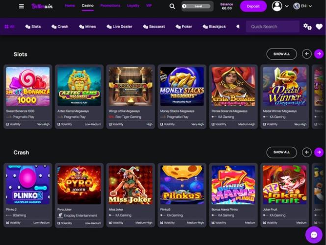 這裡有多個引人入勝的類別,包括老虎機、崩潰遊戲、地雷遊戲、真人荷官遊戲、二十一點遊戲、骰子遊戲、輪盤遊戲、龍虎遊戲、賓果遊戲、刮刮樂遊戲、桌上遊戲等等。這是一個對加密貨幣友好的品牌,您可以嘗試各種加密貨幣遊戲,並探索其他博彩庫,但首先您需要建立一個玩家帳戶。