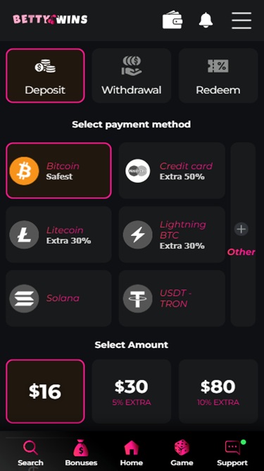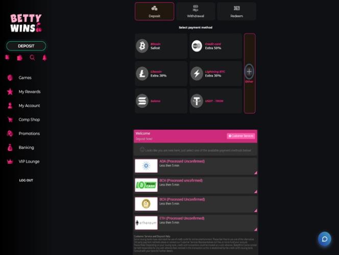 BettyWins 賭場除了允許玩家使用Visa和Mastercard作為傳統的存款和提款支付方式外,還允許玩家使用各種加密貨幣作為主要的銀行業務選項。可用的加密貨幣包括比特幣、比特幣現金、狗狗幣、以太幣、萊特幣、 Solana和Tether 。
