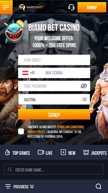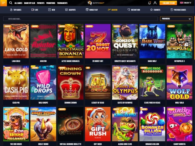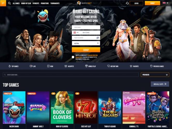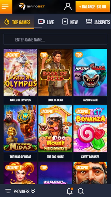 Biamo.Bet 賭場平台採用金色細節和深色模板,營造出迷人的線上賭博氛圍。它外觀時尚,遊戲成為焦點。遊戲縮圖絕對不會分散用戶的注意力;介面極其友好,註冊過程只需一秒鐘即可完成。
