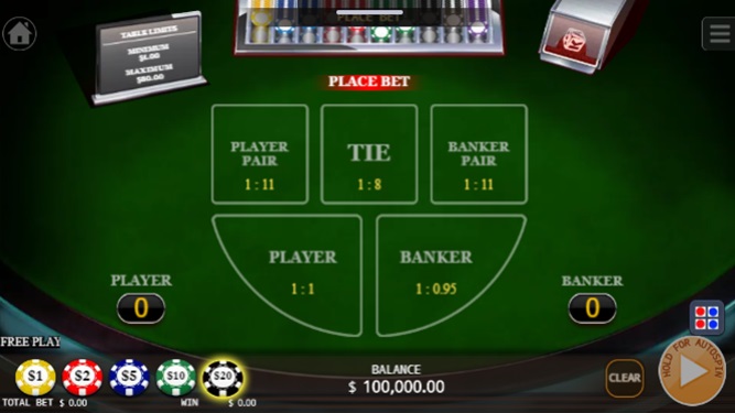 賭場之間因為競爭的緣故, Baccarat百家樂在tie和局通常⽀付9⽐1賠率, 或是Banker莊家的押注⽀付0.96的賠率, 不過Microgaming的賭場提供與 陸上賭場相同的標準規則。