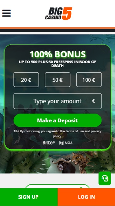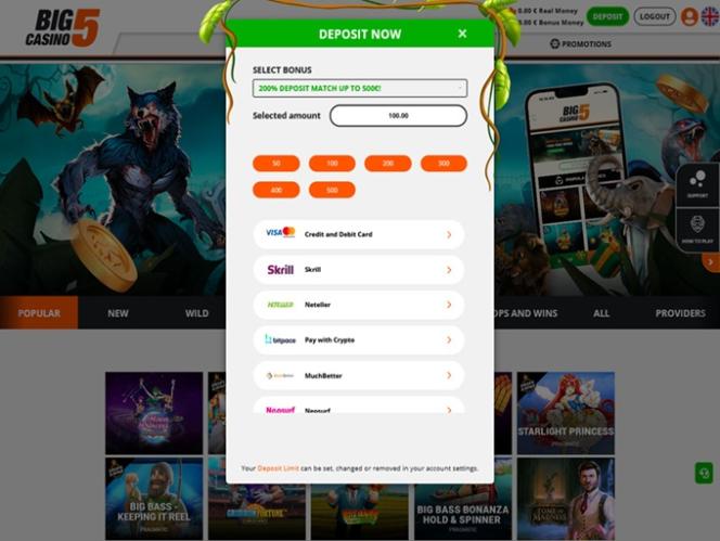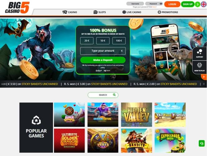 Big5 賭場由 Microgaming, Net Entertainment, BetSoft, Amatic Industries, Big Time Gaming, ELK Studios, Evolution Gaming, iSoftBet, Oryx, Play'n GO, Quickspin, Rabcat, Relax Gaming, Thunderkick, Wazdan, Realistic Games, Booming Games, Pragmatic Play, Red Tiger Gaming, Red Rake Gaming, Kalamba, Spin Games, Triple Edge Studios, Northern Lights Gaming, Stormcraft Studios, Electric Elephant Games, All41 Studios, Gameburger Studios, Neon Valley Studios, Golden Rock Studios, SpinPlay Games, 7Mojos, Games Global, 2by2 Gaming, Merkur Gaming, Tom Horn Gaming, Gamomat, Foxium, Just For The Win, Storm Gaming Technology, Slingshot Studios, Golden Hero, Fortune Factory Studios, 4ThePlayer, Gamevy, Crazy Tooth Studio, Alchemy Gaming, Snowborn Games, Hacksaw Gaming, Max Win Gaming, Gold Coin Studios, Half Pixel Studios, Peter And Sons, Eurostar Studios and Bombay Live提供支持,賭場遊戲透過基於網頁的即時遊戲平台提供,可透過您的網路瀏覽器存取。此外,還提供全面的行動支持,您可以在智慧型手機或平板電腦上暢玩。