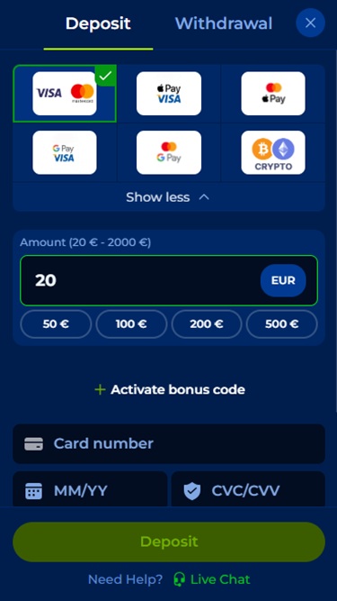 賭場採用深藍色背景和綠色色調的亮麗配色,具有直覺的使用者介面,玩家可以輕鬆瀏覽。環境簡潔直觀,因此您不會被不必要的資訊和臃腫內容所淹沒,從而避免造成加載時間的延遲。