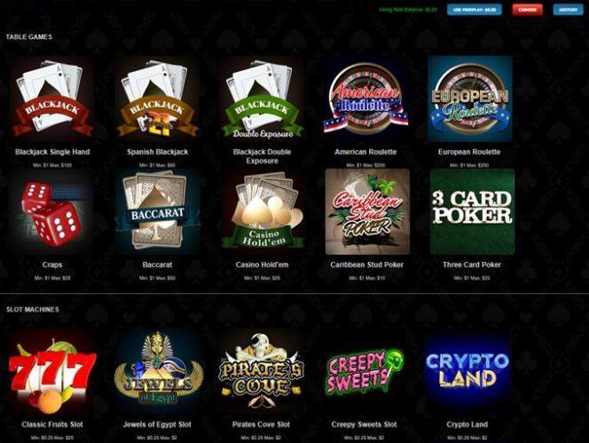 這裡有一些有趣的遊戲:單手二十一點、 Jacks or Better 、美式輪盤賭、擲骰子、埃及珍寶老虎機、Beat the Bookie 老虎機、百家樂、Deuces Wild、Pirates Cove 老虎機、Creepy Sweets 老虎機、Crypto Land、Casino Hold'em…