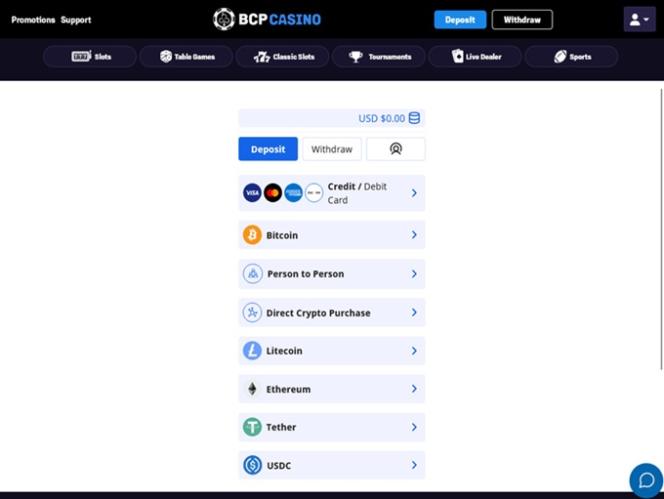 在 Black Chip Poker,您可以使用Visa、MasterCard 和 American Express等熱門卡付款,也可以使用支票和線上支付系統等其他傳統方式付款。如前所述,該賭場平台還支援加密貨幣,允許玩家使用比特幣、以太坊、萊特幣、USDT 和其他數位貨幣進行交易。