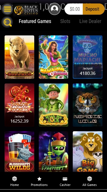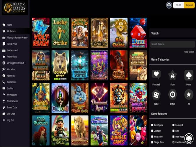 Black Lotus 賭場由 Microgaming, Net Entertainment, BetSoft, Amatic Industries, Espresso Games, Rival, Saucify, Vivo Gaming, Endorphina, GameArt, Betgames, Booongo, Felix Gaming, Red Rake Gaming, Inbet Games, Fugaso, Belatra Games, Kalamba, Platipus Gaming, Nucleus Gaming, Spinmatic, Spadegaming, BGAMING, Fazi, Evoplay, SA Gaming, OneTouch, Pocket Games Soft, Triple PG, Mascot Gaming, TVBet, NetGame Entertainment, TrueLab Games, Mancala Gaming, 7Mojos, SmartSoft Gaming, KA Gaming, Atmosfera, Caleta Gaming, Amusnet Interactive, Tom Horn Gaming, Genii, Mr Slotty, Apollo Games, NetGaming, PlayStar, Vibra Gaming, Gamzix, Triple Cherry, Dragon Gaming, Amigo Gaming and Funky Games提供支持,其遊戲透過基於網頁的即時遊戲平台提供,可透過您常用的瀏覽器直接載入。該賭場還全面支援行動端遊戲,您可以在智慧型手機或平板電腦上暢玩。