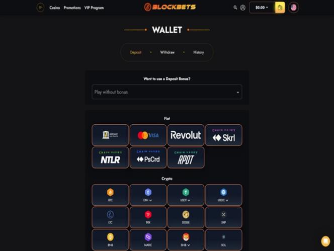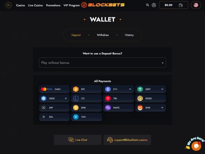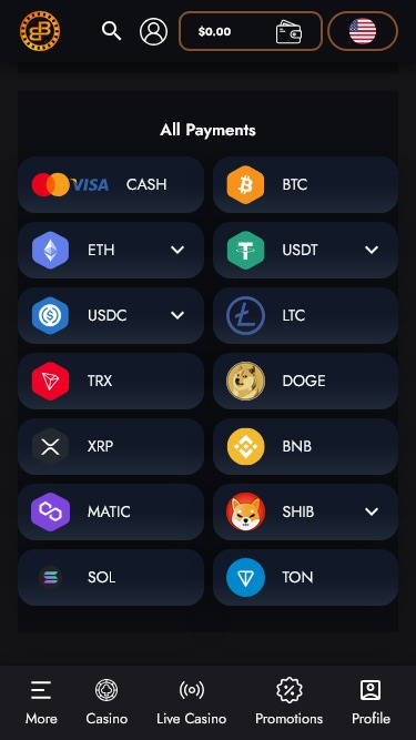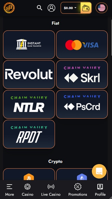 在這裡,玩家可以使用信用卡和金融卡等傳統銀行業務選項,以及Cardano、比特幣、狗狗幣、Tether、以太幣等加密支付系統和加密貨幣。