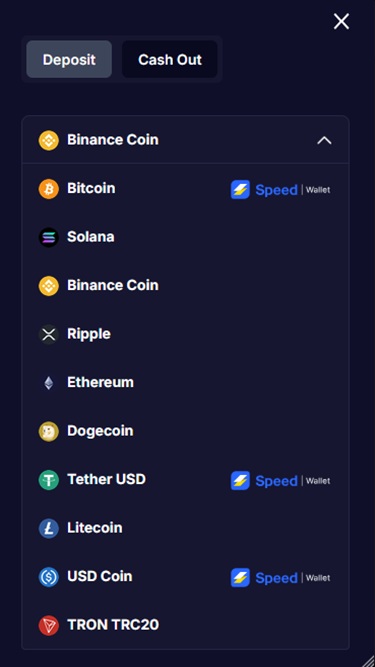 鑑於這是一家僅接受加密貨幣的賭場,它提供多種加密貨幣用於存款和提款也就不足為奇了,其中包括比特幣、以太坊和波場幣等等。據平台稱,交易速度極快,大多數交易都能在幾分鐘內完成!