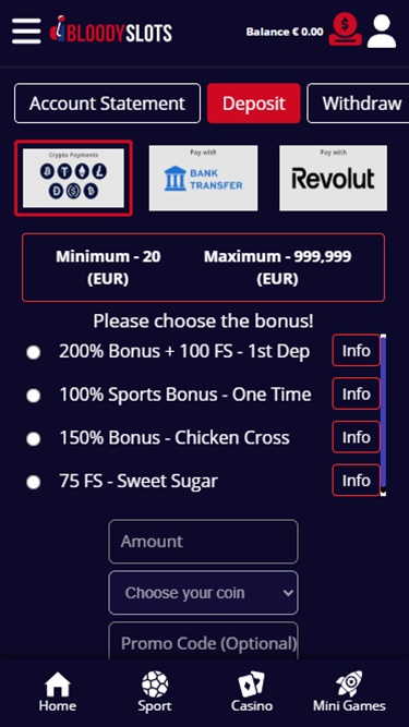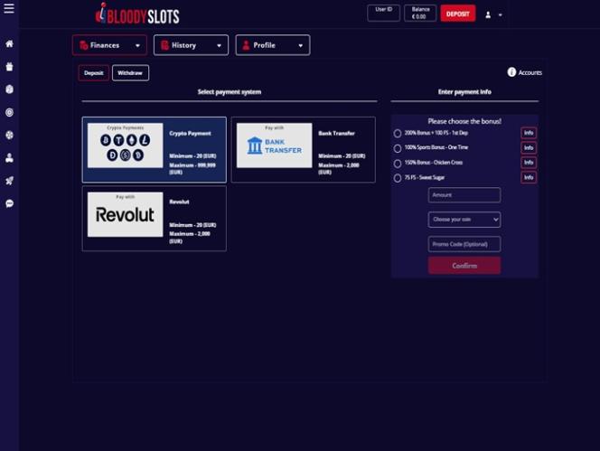 雖然您在 Bloody Slots 可能無法享受忠誠度獎勵,但該賭場準備了相當多的促銷活動和獎金來彌補這一不足。首先,註冊帳戶後,您將有資格領取豐厚的歡迎禮包,其中包括多項存款匹配優惠,專為賭場玩家和體育博彩玩家設計。
