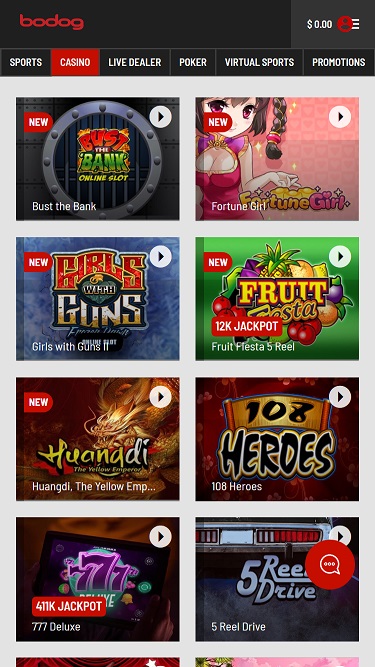 Bodog.com 由 Microgaming, BetSoft, Big Time Gaming, Evolution Gaming, Ezugi, Genesis Gaming, Habanero Systems, lightningboxgames, Oryx, Rabcat, Rival, Wazdan, Realistic Games, Booming Games, Pragmatic Play, Spinomenal, Fantasma Games, Kalamba, Revolver Gaming, Skywind, Spadegaming, Triple Edge Studios, BGAMING, Evoplay, Stormcraft Studios, Pocket Games Soft, All41 Studios, Gameburger Studios, Pulse 8 Studios, Neon Valley Studios, Golden Rock Studios, SpinPlay Games, Qora Games, SmartSoft Gaming, Buck Stakes Entertainment, Games Global, 2by2 Gaming, bluberi, Leander Games, WMS, SG Interactive, Gamomat, Scientific Games, Bally Wulff, Foxium, Zitro, Just For The Win, PearFiction Studios, Wild Streak Gaming, Slingshot Studios, Golden Hero, Fortune Factory Studios, Crazy Tooth Studio, NetGaming, Japan Technicals Games, Snowborn Games, Hacksaw Gaming, Aurum Signature Studios, Area Vegas, 3 Oaks Gaming, Wishbone Games, NextSpin, Spribe, Gaming Corps, Nailed It! Games, Playnova, Atomic Slot Lab, Neko Games, Reel Kingdom, Oros Gaming, Indigo Magic and Light & Wonder提供支持,賭場遊戲透過網頁介面運行,可直接透過您的網路瀏覽器載入。該公司的平台運作流暢,易於導航,並且不會佔用太多電腦資源。此外,Bodog.com 還支援行動遊戲,您可以透過智慧型手機或平板電腦進行投注。
