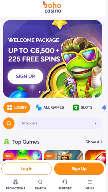 這個博彩品牌擁有一個採用柔和色彩設計的精美平台。介面看似簡約,但組織有序,功能齊全。 BOHO針對桌上型電腦和行動裝置進行了最佳化,無論玩家選擇使用哪種裝置暢玩自己喜愛的遊戲,都能獲得良好的遊戲體驗。
