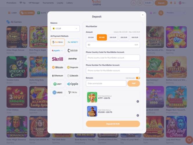 經常造訪 BOHO 賭場並參與真錢賭場遊戲的玩家,可以兌換每周存款獎金。此外,還有一項針對高額玩家的豐厚獎金。
