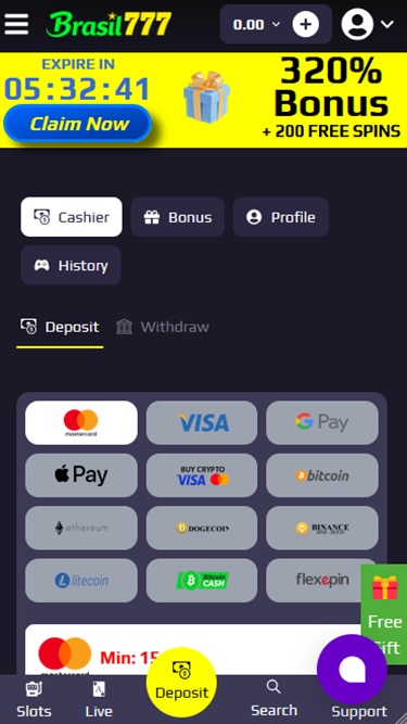 關於銀行選項,Brasil777 接受多種付款方式供玩家使用,包括Visa 、 Mastercard 、銀行電匯、 Apple Pay 、 Google Pay和Interac 。賭場也接受各種加密貨幣,例如比特幣、比特幣現金、狗狗幣、以太幣、萊特幣、 USD Coin和泰達幣。